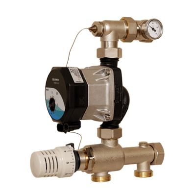 Ready-to-mount, compact control unit to control supply temperature in radiant panel heating systems up to 14 kW heat demand. Supply temperature setting range: 20–70 °C, temperature limiting and locking facility on thermostatic head. Pre-wired pump and temperature limiter. Can be mounted on the right or left side of the manifold. Suitable for all Watts 1" M heating circuit manifolds. Nickel plated. Insulation box is available as an accessory.