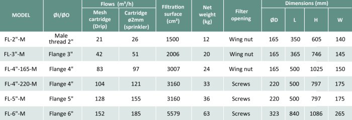 Materials: Carbon steel metal components. Zinc plated screws 6.8. Mesh cartridge : PVC structure with AISI-316 Stainless Steel. Filtration degree: 125 microns. Grinding cartridge: AISI-304 Stainless Steel. Ø2 mm pass. EPDM gaskets: 60 SHORE.