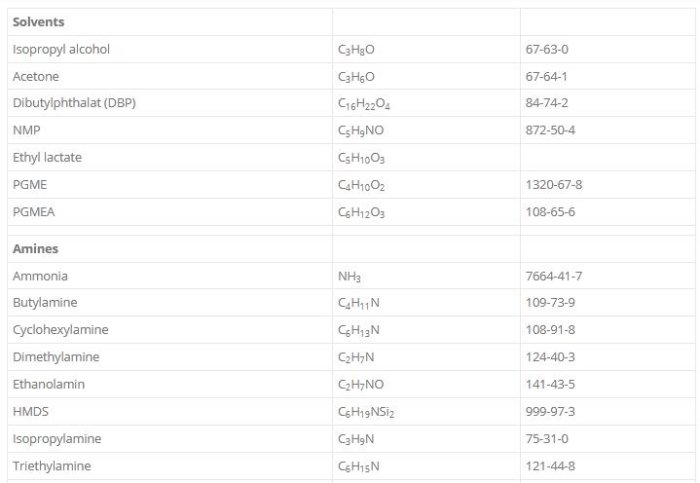 - Doping gases, NH3, Amines, B2H6, …Solvents