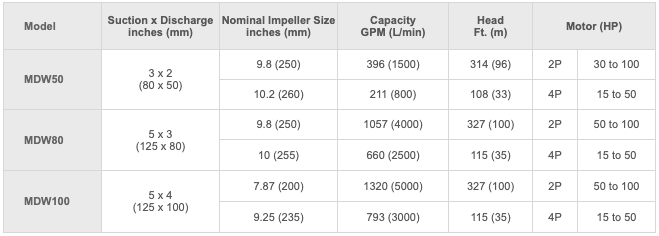 - High discharge capacity, High head and high efficiency – The heavy-duty MDW is capable of a maximum discharge capacity of 5,000 L/min and max. discharge head of 98m, enabling applications in previously unexplored areas with a wide range of liquid specific gravities.