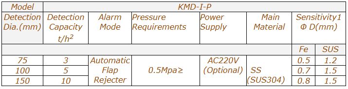 Granule and other forms of products. Metal Detector KMD-I-P Series: Compact design, small occupied space. Rapid rejecting mechanism, to reduce the waste of the materials. In line with the GMP requirements, easy to install and to clean. Circuit design is more stable than traditional analog machine and also a higher sensitivity. Special design of the mechanical structure, to effectively avoid the external interference like vibration, noise, product effect, etc.