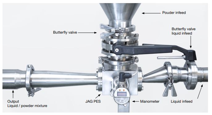 The JAG PES Powder Infeed System was developed to feed powder solids into liquids and works according to the Venturi principle. It is suitable for use under extremely tough conditions in the pharma, biotech, chemical and food industries.