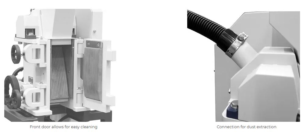 A front door gives direct access to the crushing chamber at a perfect height for ergonomic and easy cleaning. The feed hopper with splash-back protection can be removed quickly and easily. The BB 400 has a connection for dust extraction and is protected against mechanical overload. A scale indicates the wear of the breaking jaws, informing the user when it is time for an exchange.