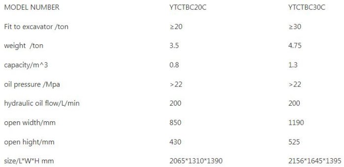 Model number:YTCTBC30C. Fit to excavator weight (any brand):≥30 ton. Weight :4.75 ton. Operating pressure:>22 mpa. Hydraulic oil flow :200 l/min. Color:any color. MOQ:1 set. OEM :yes.
