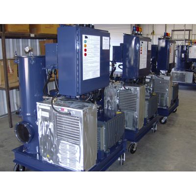 Our most popular model of the vacuum distillation series. Low vacuum of 26” HG is pulled on the process oil while heated and filtered. Water removal rates of more than 3 gallons per hour can be achieved in many applications and total water can be reduced to less than 100 PPM. Standard features include Variable Speed Drive controller, inlet solenoid shut off safety, wing-nut closures, liquid ring vacuum pump with chiller, DP and pressure gauges on post filter vessel, interior and exterior epoxy paint, inlet/outlet hoses, and ball valves on all ports.