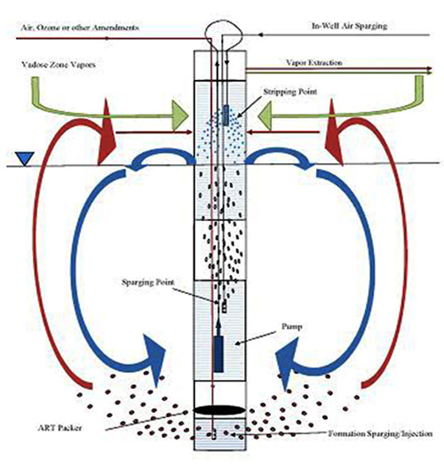 As part of our continued efforts to improve the ART Technologies and increase efficacy, the ART-Jection Technologies alternative has been developed. This technology builds on the proven ART Integrated design and allows for the addition of amendments (gas or liquid) directly into the formation as part of the in-well processes. Amendments may include ozone, nitrogen and other chemical or biological amendments (gas or liquid). Chemicals added into the saturated zone via the injection point will be mixed further by the subsurface circulation and to be delivered throughout the sphere of influence. This innovative design, detailed in Figure 2, will provide clients a wider range of options to maximize the chances of success. It should be noted that in this design, the injection process and pumping may be operated alternately depending on site specifics to minimize the potential of extracting chemicals into the ART well and allow for dispersion into the subsurface.