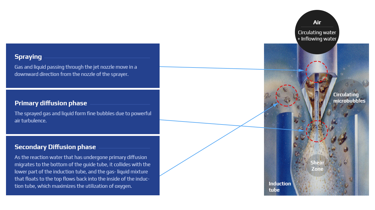 • Wastewater, microorganisms, and air are mixed through turbulent air flow generated by the jet nozzle injection to maintain optimal conditions for microbial growth.