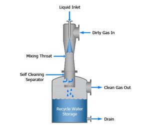 The Jet Venturi scrubber is similar to an Ejector or Eductor. That is, it has a spray nozzle which creates a high velocity of one fluid, typically water. In the Fume scrubber, the second connection on the Venturi is for gas. The gas can be air with dust or fumes. It can be process flow such as fuel gas in a synthetic fuel plant.