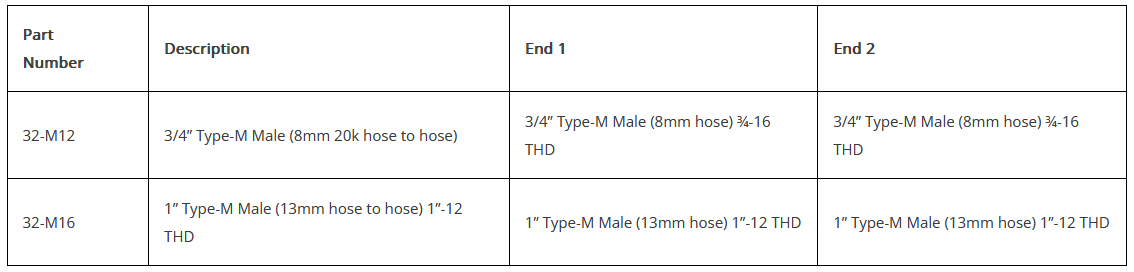 Male Type-M connection on both ends. Each Type-M fitting is rated for the full working pressure of the hose. Compatible with any system requiring Type-M connections for hose assemblies. 300 series stainless steel
