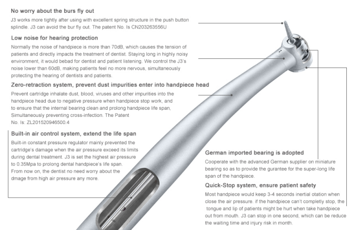 Built-in air control system, extend the life span. Quick-stop system, ensure patient safety. Low noise for hearing protection. No worry about the burs fly out. Zero-retraction system, prevent dust impurities enter into.