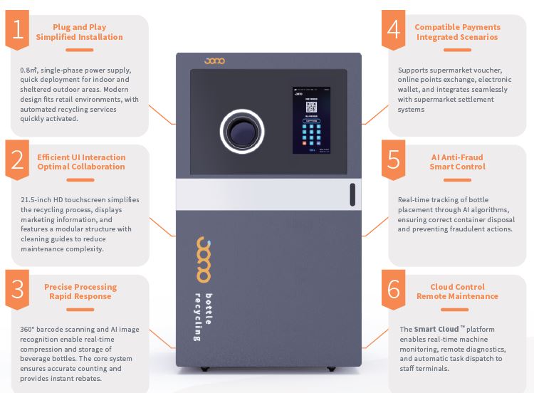 The E-Series Reverse Vending Machine is designed to handle one type of container at a time, suitable for collecting plastic bottles, cans, or glass bottles. It is equipped with a degree barcode scanner and the most advanced AI detection system to ensure optimal performance. By using of more integrated communication and control methods,the machine maintains stability while incorporating cutting-edge AI algorithms to monitor the entire user delivery process, enhancing anti-fraud capabilities.
