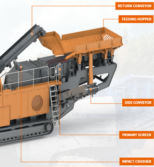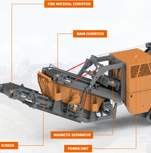 Heavy duty screen applied for structural stability; separate primary screen applied for higher screening efficiency than the monolithic type, reducing wear costs on the crushing chamber; double deck screen with different combinations of upper and lower deck; discharge to the side conveyor or the vibratory discharger and then to the main conveyor.