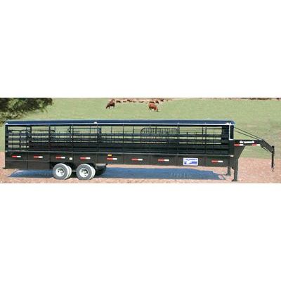 7`6` width inside & 102` outside, treated pine floor, LT235 85 R16 10 ply Goodyear tires, 2 - 5/16` adj. (25K) coupler, spare tire, wheel & rack, lengths 28`, 32`, 36`, 40`, electric brakes, 6`6` belly height, 3 - plank spaced sides, 2 - 10K H.D. dual tandem axles, split tailgate, 8` rear section, two speed double jacks.