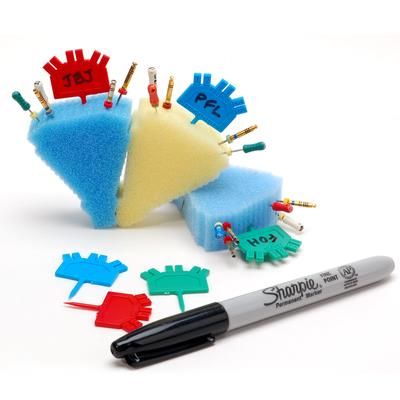The EMT – EndoRing Marking Tabs Endodontic File Organizers enable the clinician to easily organize the EndoRing Foam inserts before a procedure. Three colors of EMT organizers help differentiate files of varying lengths or types when they are placed into a foam insert prior to steam autoclave processing. The user can track how many times a set of files has been used by easily removing one of the six numbered tabs located on the top edge of the EMT organizer. The EMT organizer’s textured surface can be marked with an indelible ink pen to indicate patient or file set-up information.