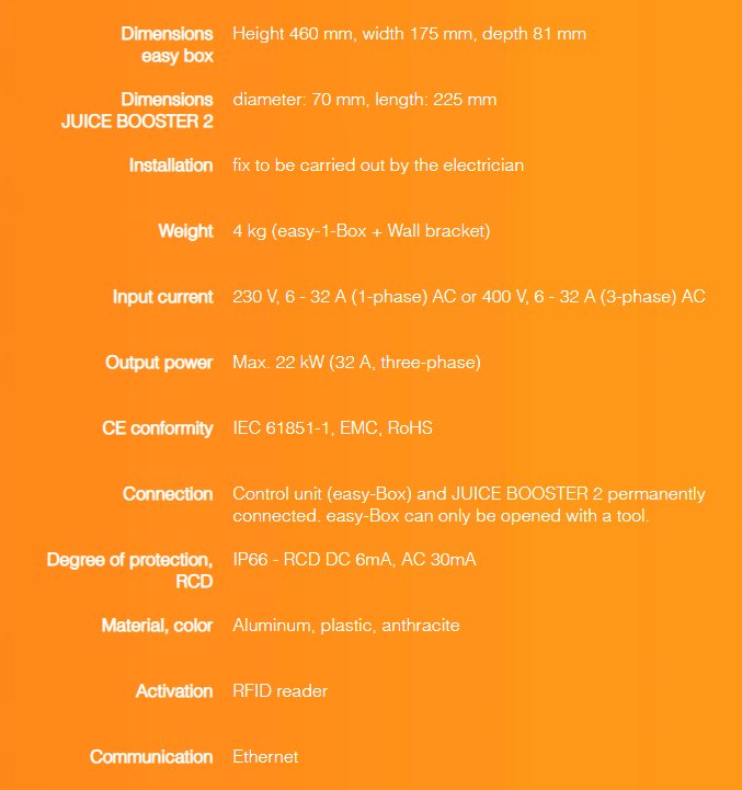 The JUICE CHARGER easy is an affordable, versatile and reliable wallbox. Ideal for charging at home or at company-owned underground parking garages, and subsidized by the funding programs of the Swiss canton of Wallis and by KfW development bank in Germany. Identifying, activating, controlling. The easy box turns the charger into a permanent wall-mounted charging station. It is robust, and allows power-provider remote control and controlled load shedding. So you’re equipped for the future!