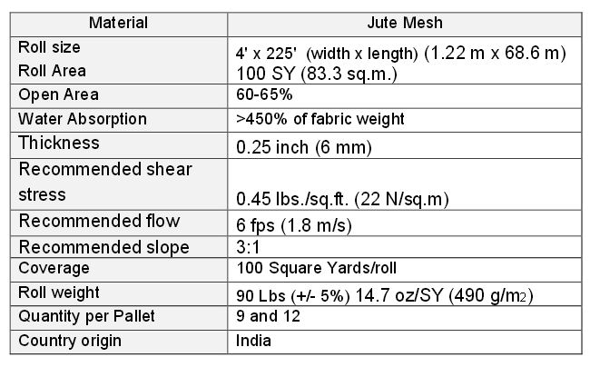 Jute is made from natural fibers of a bamboo-like plant and is rated as one of the most dependable and proven erosion products available. Jute stabilizes the soil and promotes the establishment of permanent vegetation on all types of slopes (road slopes, drainage slopes, landfill slopes, and backyard slopes, etc.) Jute conforms to slope contours and surface irregularities. Jute stabilizes surface soil on slopes with thousands of tiny check dams per square yard. Rolls are 4` X 225` and palletized 12 to a pallet - 48 rolls per tier and 480 rolls per truckload in a standard 53` Van.