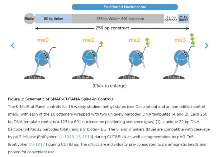 The SNAP-CUTANA K-MetStat Panel of spike-in controls for CUT&RUN and CUT&Tag offers an all-in-one solution to determine antibody specificity for histone posttranslational modifications (PTMs), monitor assay success, and normalize data for quantitative chromatin mapping. The panel contains designer nucleosomes (dNucs) representing 16 different K-methyl PTM states: mono-, di-, and trimethylation at H3K4, H3K9, H3K27, H3K36, & H4K20, as well as unmodified control (Figure 1). Each PTM is represented by two unique DNA-barcoded templates (A and B, for an internal technical replicate). Each dNuc is individually conjugated to paramagnetic beads and pooled into a single panel for convenient one-step spike-in to CUT&RUN and CUT&Tag experiments. The panel is added to samples alongside ConA-immobilized cells prior to the addition of an antibody targeting a histone lysine methylation state or IgG negative control (see Application Notes and Table 1).