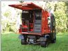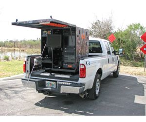 Wireless control of all camera, transporter, and reel functions. Enables operation of the system remotely from any angle up to 100 ft. Compact, lightweight, rugged, weatherproof enclosure. Can fit into a pick up truck, ATV, or Van. Partition separates the video cable reel with tractor and camera storage from the power control unit, monitor, and optional computer based data acquisition system. All controllers, TV monitor, and power control are rack mounted to maximize ergonomic operation and protected by a sealed and lockable hatch. The racks are mounted with shock-isolators to prevent equipment damage from jarring and vibrations. Sealed front door is hinged, supported by a gas shock, and functions as an awning in the open position