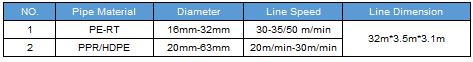This PERT Pipe Production line has two functions: it can not only produce 16mm-32mm PE-RT pipe, also it can be as 20mm-63mm PPR/HDPE Pipe Making Machine, now let`s see its technical specification .