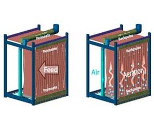 The ZeeWeed system operates under a low-pressure vacuum that is induced within the hollow membrane fibers by a connection to the suction side of a permeate pump. Operation alternates between permeation and backpulsing. Permeation refers to the period of time, when treated water is drawn through the membrane fibers by vacuum and is pumped through the permeate piping for its ultimate end-use. During backpulsing, filtered water from the backpulse tank is passed from the inside to the outside of the membrane to disrupt any particles that may be physically lodged in the membrane interstices. Figure 7 illustrates permeation and backpulse operation with a ZeeWeed 500 cassette.