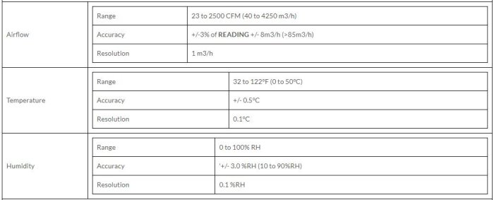 - Simultaneously measures and displays air flow, temperature and humidity
