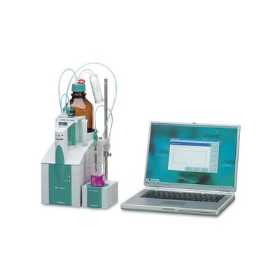 High-end titrator with built-in buret drive. Including tiamotm light titration software, 801 Stirrer magnetic stirrer, 20 ml exchange unit and combined "Ecotrode Plus" ph glass electrode. Dynamic (DET), monotonic (MET), endpoint titration (SET), Karl Fischer titration (KFT). Four MSB connectors. Optional second buret for titration. One galvanically isolated measuring interface (also for intelligent "itrodes" electrodes). USB connector.
