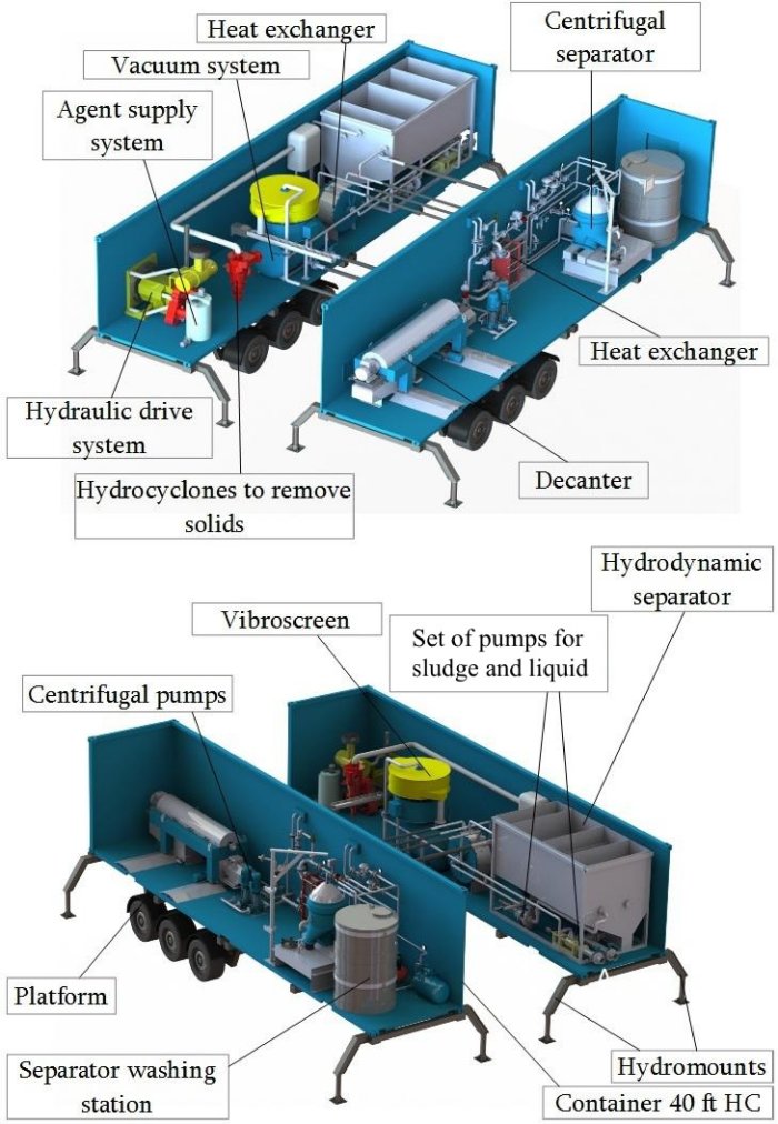 The treatment unit has a full mobile operation and can be placed in two 40 ft high cube containers (HC). The removed sediment undergoes maximum separation: at the first stage the mechanical impurities are separated from the received pulp, At the next stage the liquid mixture is separated in two fractions : water and hydrocarbons.
