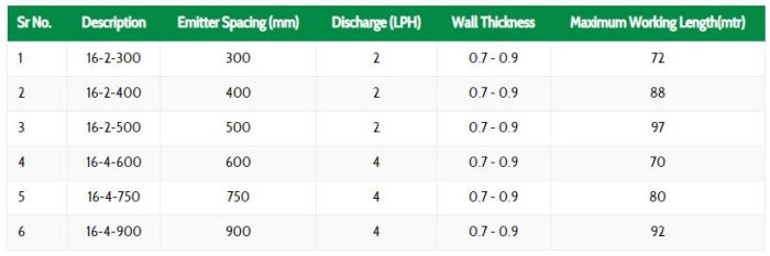 Uniform & accurate water discharge. Resistance to any chemical. U.V. Stable. No any environmental effect. Available with standard ISI Mark. Available in different emitter spacing. Available with all accessories. Produce from 100% virgin material. Produce in hi-tech, high speed, imported machinery. Available in 300 Mtr. coil.