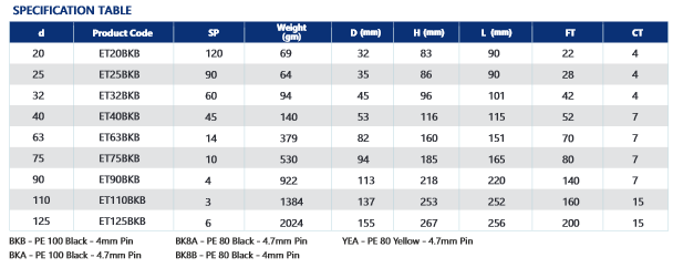 Kimplas Electrofusion Equal Tees are manufactured in PE 80 (Yellow) & PE 100 (Black) material and are of SDR 11 rating. For exact recommendations on compatibility, for welding with SDR 9 through SDR 21 or PN 6 through PN 16 pipe, refer Kimplas Technical Specifications Manual. Kimplas Electrofusion fittings are suitable for permanently connecting to PE 80 and PE 100 pipes, both in straight as well as in coil form.