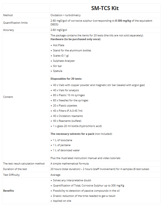 The SM-TCS Kit (Sea Marconi – Total Corrosive Sulphur) continues to be the only truly effective and reliable solution to know precisely how corrosive an insulating liquid is.xceeds the limits stated by national laws.