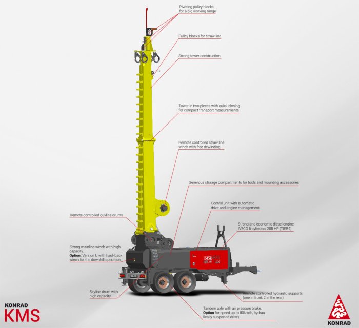 The KMS 4000 is a remote controlled skyline crane which is mounted on a tandem trailer. The operation of the installation is remote controlled. To increase the productivity, an automatic drive function of the carriage is standard. Very comfortable is the rigging up of this installation. All the functions can be operated by remote control. This installation connects a high grade of working safety with an outstanding productivity.