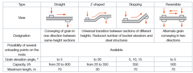 Use of polyurethane scrapers ensures low energy consumption, reliability, and longevity of the traction device along with reduced damage to the product being transported and low level of noise from the operating equipment. The conveyor is covered in full, which prevents the emission of dust.