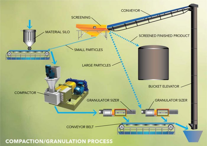 Typical compaction and granulation plants include special auxiliary equipment used for milling, screening, mixing, de-aeration and material handling. This equipment needs to be properly selected and designed to ensure proper operating conditions and quality product.
