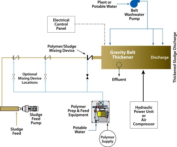 A Gravity Belt Thickener employs gravity drainage through a filter belt to thicken polymer conditioned sludge prior to digestion, mechanical dewatering, or trucking to a land application site or disposal site.