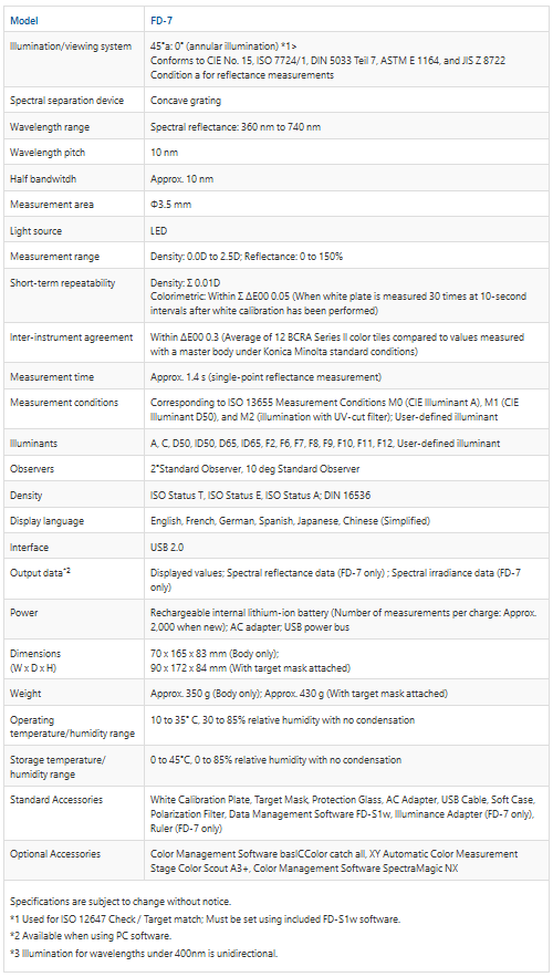 - Konica Minolta’s original VFS (Virtual Fluorescence Standard) technology allows for L*a*b* measurements that correspond to ISO 13655 Measurement Condition M1 (CIE Illuminant D50).