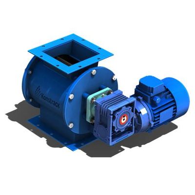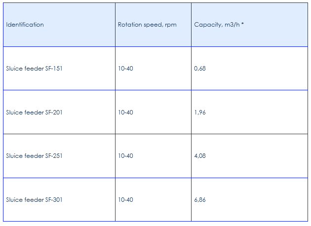 As the rotor rotates, the filled cells move downward and the material is removed through the bottom spigot. The capacity of the sluice gate depends on the volume of the cells and the