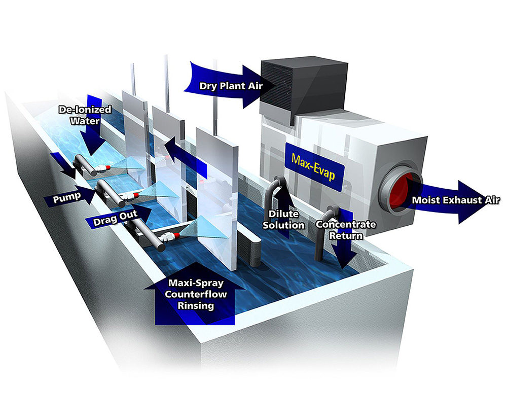 When used together Max-Evap andu00a0Maxi-Spray systems, the plating process is optimized, maintaining consistent solution in theu00a0chemistry, and closing the loop. The Max-Evap evaporates all excess water produced by spraying.