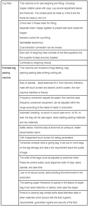 This packing unit consists of one premade bag packing machine for packing ,one set cup filler for weighing , one screw elevator for feeding ,one platform for supporting weigher and one conveyor for taking off the finished bags .It integrates functions of automatic bag-feeding,bag-opening, weighing, filling, sealing, cooling into one. The advanced design has guaranteed this machine suits for different kinds of granules,like salt,rice and seeds. Its adjustment , operation and maintenance are very convenient.