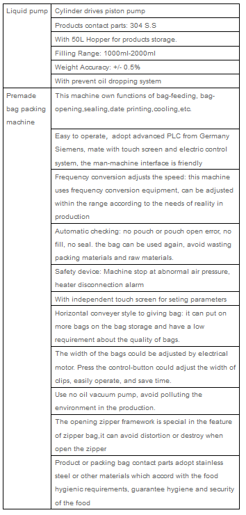 This packing unit consists of one premade bag packing machine for packing ,one set liquid pump for weighing , one liquid storage and pump feeding device and one conveyor for taking off the finished bags .It integrates functions of automatic bag-feeding,bag-opening, weighing, filling, sealing, cooling into one. The advanced design has guaranteed this machine suits for different kinds of granules,like salt,rice and seeds. Its adjustment , operation and maintenance are very convenient.