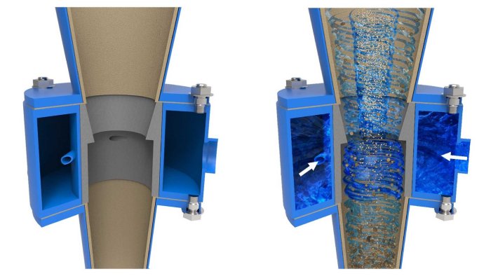 The injection liquid serves as the displacement agent of fine particles that are entrained in the underflow pulp. With creation of a “secondary classification” within the hydrocyclone, displaced fines rise within the centre of the hydrocyclone, joining the overflow pulp. The coarse solids are thickened and discharged through the apex as a well-deslimed underflow.