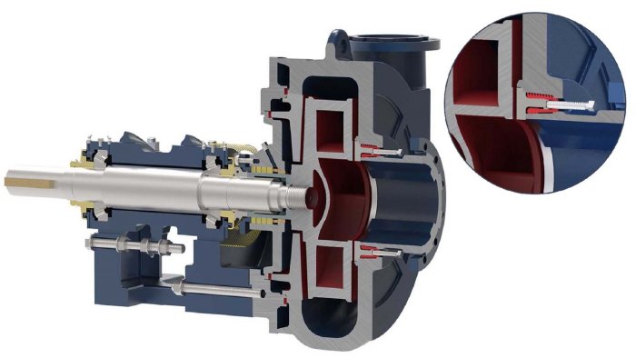 - Impeller: Designed for high slurry efficiency and hydraulic performance. Machined surface at the eye for wear ring adjustment and high expelling vanes.