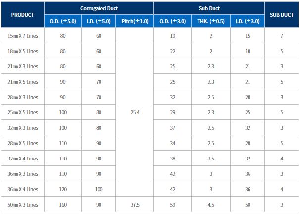 KUPP’s HDPE Corrugated Optic Duct which is widely used for more convenient urban infrastructure facilities, communication and road traffic network construction, provide excellent physical strength and convenient construction. Its excellent physical strength and convenient installation, it is preferred by major domestic and foreign telecommunication companies and road construction. COD’s high rigidity corrugated structure protects inner pipe and cable from earthquakes and land subsidence with strong compression load strength and inherent flexibility.