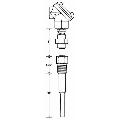 Complete thermowell assemblies in stock Thermocouple or RTD models Most popular immersion lengths Spring loaded design Choice of extensions between thermowell & head Drilled barstock, 316SS thermowells 3/4" NPT process connection Weatherproof heads: cast aluminum .250" - 304SS probes Extensions: spring loaded fitting or spring loaded fitting/union/nipple.