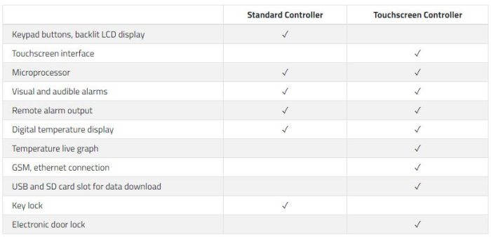 - audible and visual alarms for high/low temperature, door open, and power failure