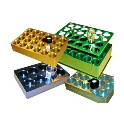 Nobody wants to constantly rack and re-rack vials between instruments, ovens, evaporators, and robotics. These hard wearing & hard working MiniRax® are the perfect solution. We’ll work with your quantities and labware types to ensure everything is color keyed for easy, error free, implementation. These are machined to ensure a maximum of utility with a minimum weight, and automation friendly spacing and chamfering for pick and place requirements. Please enquire for more details.