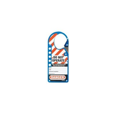 Blue lockout hasp with tagout indentification for multiple workersFeatures an easy-to-apply `snap-on` advantage with its spring-loaded locking armFits more lockout points than alternative rivet-hinge labeled lockout haspAnodized aluminum and stainless steel construction for combined corrosion-resisance and strengtComplete with high visibility, re-usable write-on safety labels (English, French & Spanish) - identify the responsible person, then erase for the next jobDimensions are 2-7/8` x 7` (7.3cm x 17.8cm) with 1-3/4` x 2-1/8` (4.4cm x 5.4cm) inside jaw diameter, holds up to 5 padlocksMaster carton qty 24. Commercial packaging