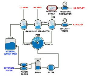 Deionised or distilled water is pumped into a Polymer Electrolyte Membrane (PEM) cell. Within the PEM cell Electrolytic Disassociation splits the water into Hydrogen and Oxygen. The Oxygen is vented safely from the system whilst the Hydrogen proceeds through the system. After passing through a gas/liquid separator the hydrogen gas enters a desiccant chamber to remove the last traces of water from the gas. The hydrogen then passes to the application via a pressure regulator.