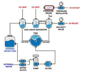 Deionised or distilled water is pumped into a Polymer Electrolyte Membrane (PEM) cell. Within the PEM cell Electrolytic Disassociation splits the water into Hydrogen and Oxygen. The Oxygen is vented safely from the system whilst the Hydrogen proceeds through the system. After passing through a gas/liquid separator the hydrogen gas enters a desiccant chamber to remove the last traces of water from the gas. The hydrogen then passes to the application via a pressure regulator.