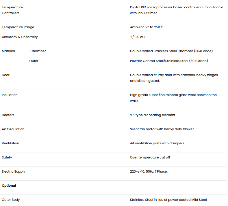 The insulation Gap between the walls is at least 100 mm. and high temperature Ceramic blanket are used as insulation material. The air circulation motor is mounted on side/top of the equipment and the blower is driven by belt pulley attachment. It protects the motor from Heat build upend damage due to it. The temperature variation is around +/- 1% of the set value on higher range. The power supply will be 220/230V AC +- 10% 50 Hz or 440V 3 phase for bigger size as per requirement.