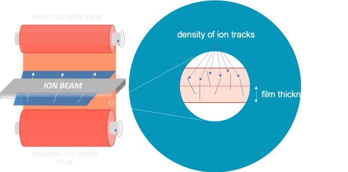 For the beaming, the polymer film is unwounded at a constant speed under vacuum through the scanned ion beam ; the tracks density (or desired pore density) is therefore precisely defined by the ion beam intensity and the film velocity.